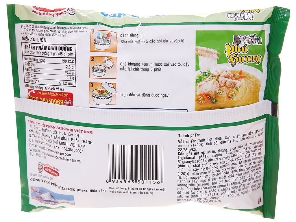 Một số thành phần dinh dưỡng nổi bật có trong sản phẩm là: chất béo, chất đạm, vitamin B12, carbohydrate, và năng lượng. Thành phần miến được chế biến từ tinh bột khoai tây, tinh bột đậu hà lan, đậu xanh nên khá bổ dưỡng. Theo thông tin trên bao bì sản phẩm, trong 100g sản phẩm cung cấp khoảng 345 kcal.